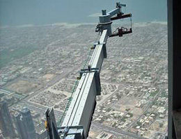 特別設(shè)計(jì)的機(jī)械臂,可以環(huán)繞哈利法塔運(yùn)行。 Cox Gomyl公司開發(fā)出12部清潔機(jī),它們總重13噸,可搭載36名清潔工人,他們使用普通肥皂水清洗哈利法塔24830塊反射玻璃,從上到下全部清潔一遍需要長達(dá)3個(gè)月時(shí)間。哈定說:“這是一項(xiàng)巨大的挑戰(zhàn),哈利法塔幾乎相當(dāng)于10到15座普通建筑。” |